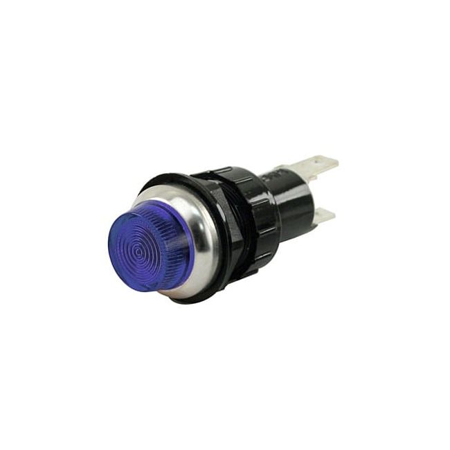 12 volt Indicator lights with spade connectors for easy installation. These lights are rated to 3 amps. To install them just drill a 3/4 inch hole and insert it through, the bevels end will prevent them from going to far. Typical applications: industrial controls, marine panels, trucks, buses and automotive