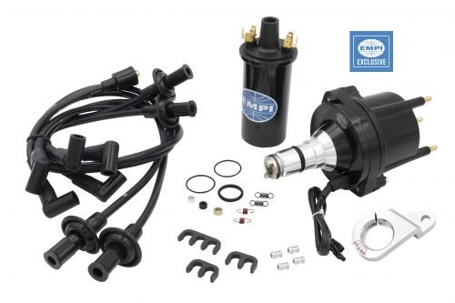 The EMPI HEI Ignition Kit improves performance and fuel economy in an easy to install and set-up package. This comprehensive kit was designed and engineered in Anaheim, CA and includes an all new HEI solid state billet distributor, 40,000-volt OE style coil that fits your stock clamp and high-quality 8.5mm plug wires. With simple hand tools you can modernize your ignition system for reliable starting and a more efficient spark. Everything you need is in the kit which includes a degreed billet distributor clamp, advance springs, bushings, spark plug terminal nuts, plug wire separators and O-rings for a clean installation since the EMPI kit doesn’t use any other modules or boxes to mount in your engine compartment!